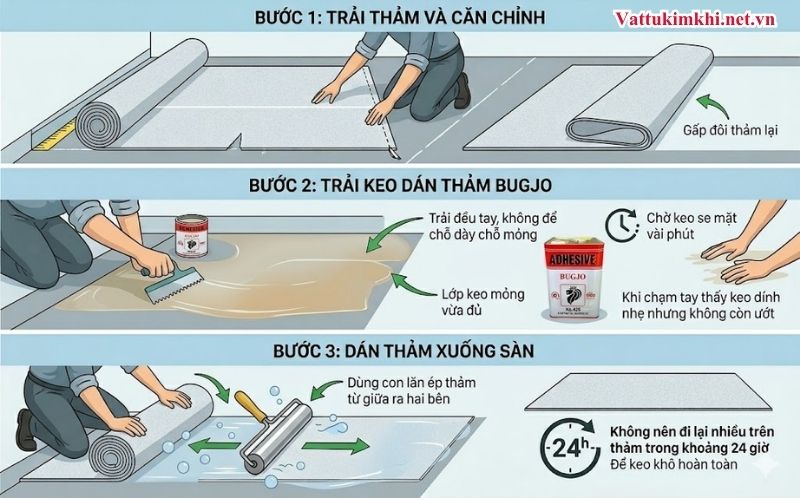 Để thảm bám chắc và không bị bong, bạn cần thực hiện theo đúng quy trình thi công dưới đây.