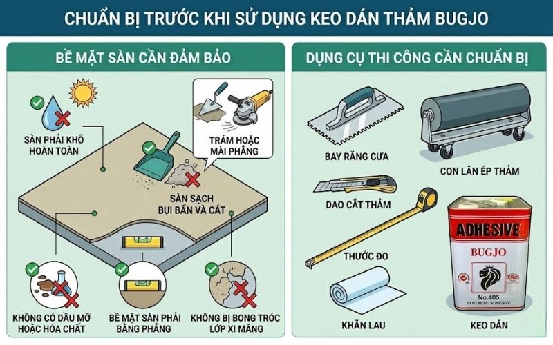 Trong thi công thảm trải sàn, nhiều người chỉ quan tâm đến chất lượng keo mà bỏ qua kỹ thuật sử dụng, dẫn đến tình trạng thảm nhanh bong, phồng hoặc xuống cấp. Thực tế, dù sử dụng Keo dán thảm Bugjo chất lượng cao nhưng nếu thi công sai cách vẫn không đạt hiệu quả như mong muốn. Bài viết dưới đây sẽ hướng dẫn bạn cách sử dụng keo dán thảm đúng kỹ thuật, giúp tăng độ bền, tiết kiệm chi phí và đảm bảo tính thẩm mỹ cho công trình.